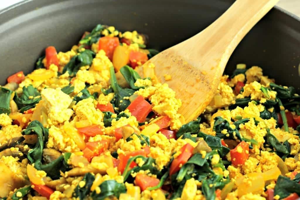 - Crumble tofu with hands over pan, mix in spices, and stir to combine