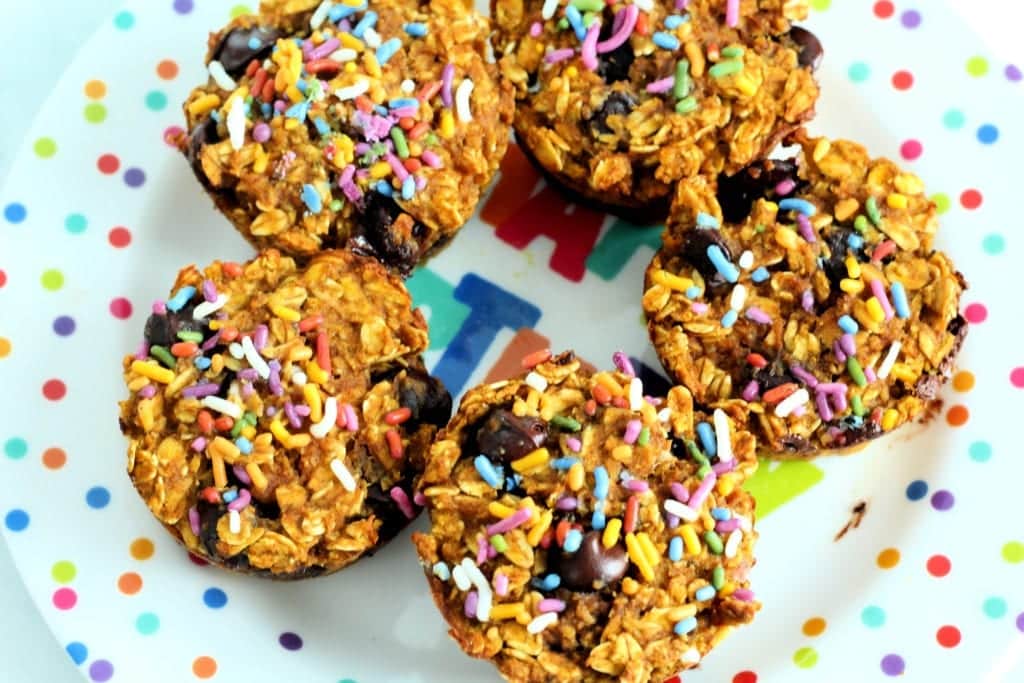 Breakfast for dessert? Either! I recommend chocolate chips and sprinkles if you are choosing a dessert options. And I recommend nuts, seeds, and/or fruit if you are opting for a breakfast option. A snack could go either way!  I added sprinkles as a birthday celebration to make them a little extra festive.
