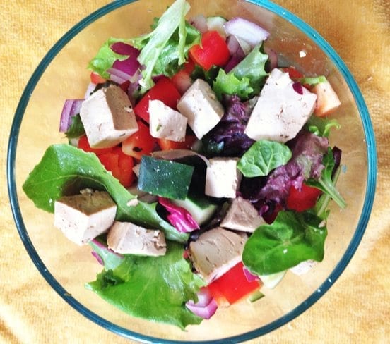 5. Assemble veggies on top of greens, add tofu and dressing. You can serve the tofu warm on the salads or allow it to cool. Also you might have so extra tofu which makes for a nice protein source for another meal- you’re welcome